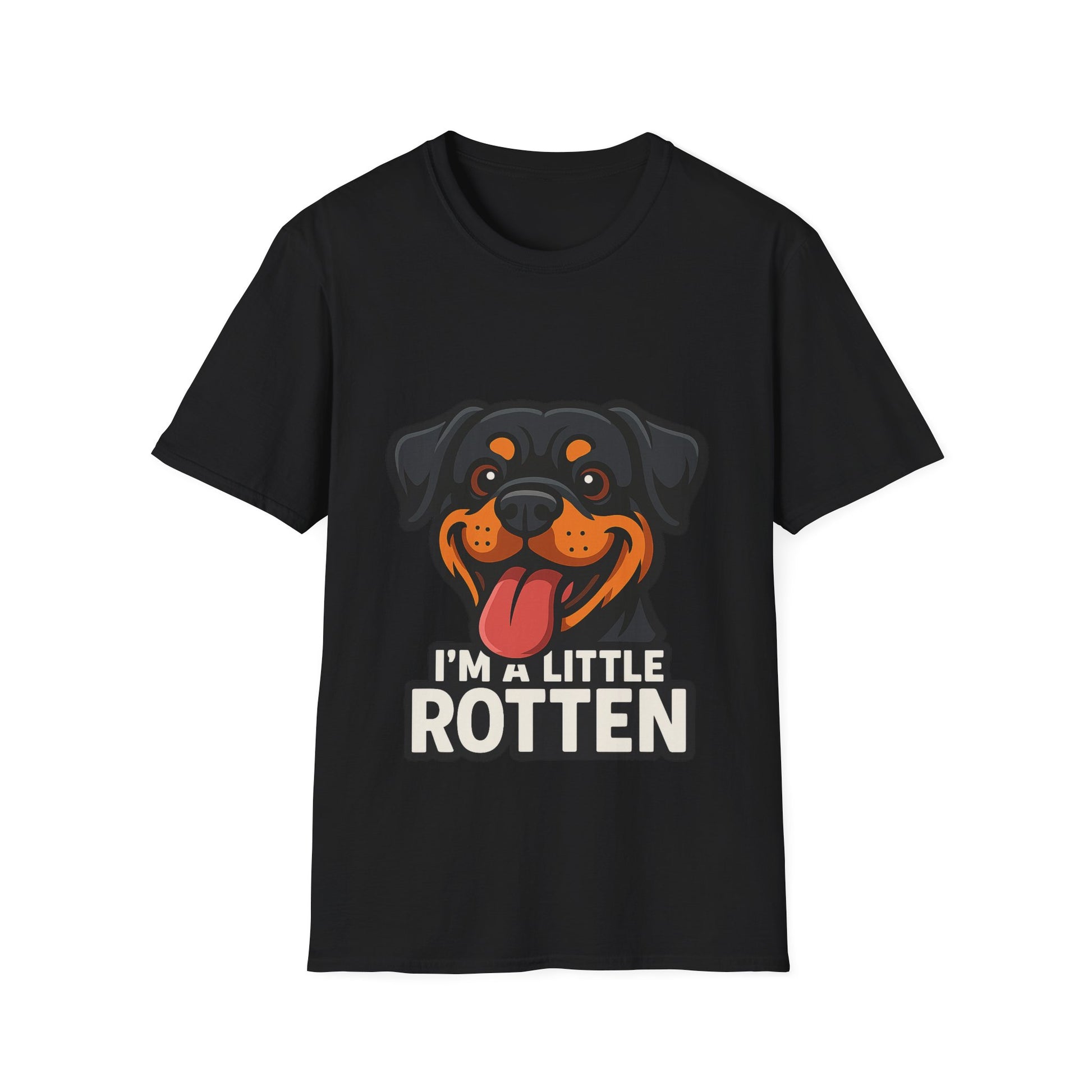 Featuring a bold cartoon-style Rottweiler with its tongue out and a mischievous spark in its eyes, this playful design brings serious personality to your wardrobe.